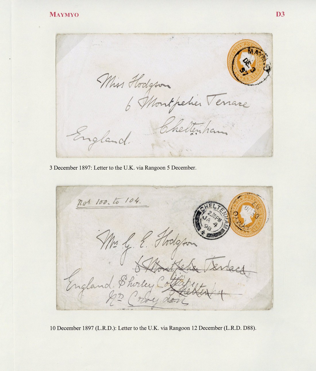 1897 (3 Dec.) and (10 Dec.) and 2½a. stationery envelopes from the same correspondence to England, both cancelled by "maymyo" c.d.s. (Type D3, the latter the latest recorded date); 1898 (22 Apr.) 2½a. stationery envelope to England cancelled by "maymyo" c.d.s. (Type D4; earliest recorded date) and 1900 (6 Jan.) ¼a. stationery card from Rangoon to Maymyo showing Type D4 arrival c.d.s. (9.1)