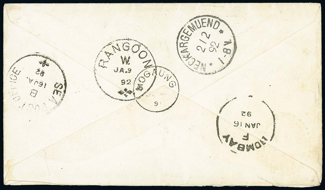 1891 (29 Dec.) 2½a. stationery envelope from Bhamo to Germany showing, on reverse, "mogaung" c.d.s. (Type D2; latest recorded date) partly overstruck by Rangoon transit d.s. Photo