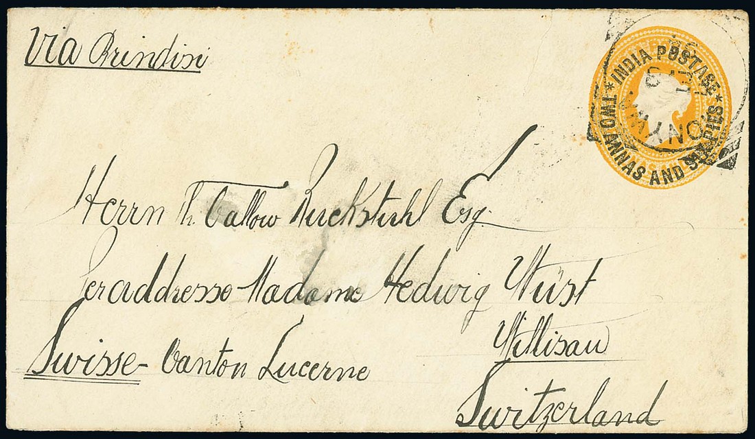 1890 (3 Apr.) ½a. stationery envelope to Devon cancelled in transit at Rangoon, uprated with 4½a. cancelled by "R" in circle of bars (Type K1) and showing, on reverse, legible "mone/fort stedman" c.d.s. (Type D1) along with Fort Stedman, Rangoon and Bombay transit datestamps. The only recorded examples of Types K1 and D1. Photo