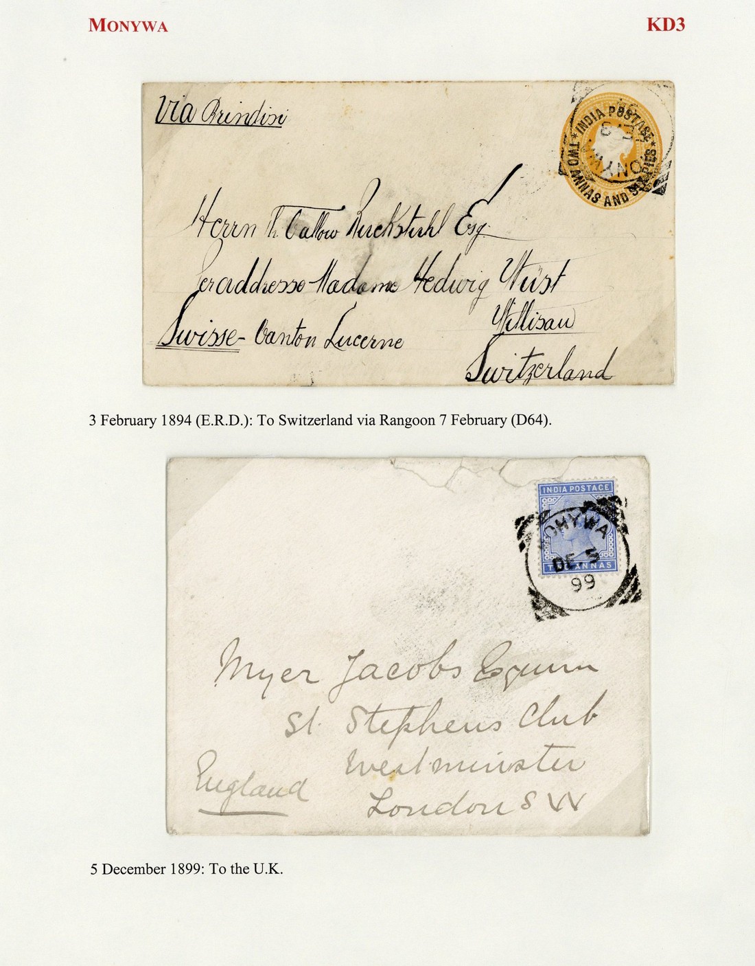 1894 (3 Feb.) 2½a. stationery envelope to Switzerland and 1899 (5 Dec.) envelope (some tears at top caused through opening) to London bearing 2a., both cancelled by "monywa" squared-circle d.s. (Type KD3; the former the earliest recorded date). Photo for first