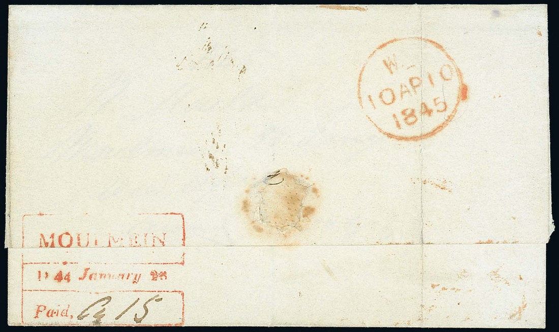 1844 (28 Jan.) entire to London, marked "p Overland Mail via Southampton", rated "1/-", showing oval-framed "india" and, on reverse, fine framed "moulmein/Paid" d.s. in red (Type PS3) and arrival c.d.s. (10.4). Photo