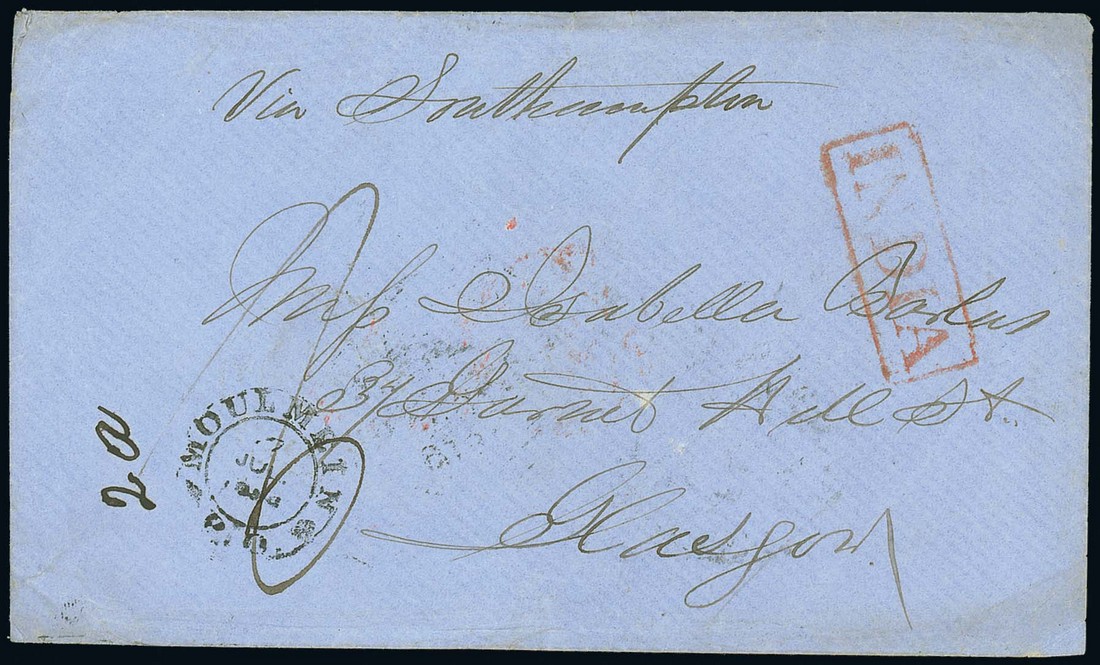 1856 (July) blue envelope to Glasgow, marked "Via Southampton", rated "2a" and "6", showing framed "india" in red and seriffed "rangoon/p.o." double-ring d.s. (Type D1); a little creased. Photo