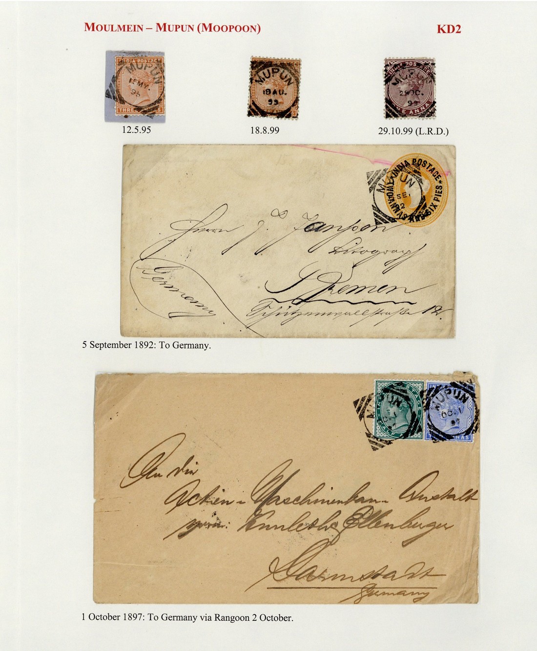 1892 (5 Sept.) 2½a. stationery envelope and 1897 (1 Oct.) envelope bearing ½a. and 2a., both addressed to Germany and cancelled by "mupun" squared-circle d.s. (Type KD2); also three loose adhesives similarly cancelled