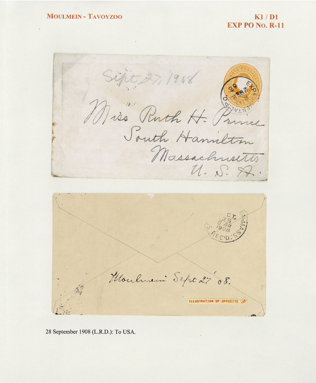 1908 (28 Sept.) 2½a. stationery envelope to USA, clearly cancelled by "experimental p.o./r-11" c.d.s. (Type D1; latest recorded date); a fraction soiled and creased