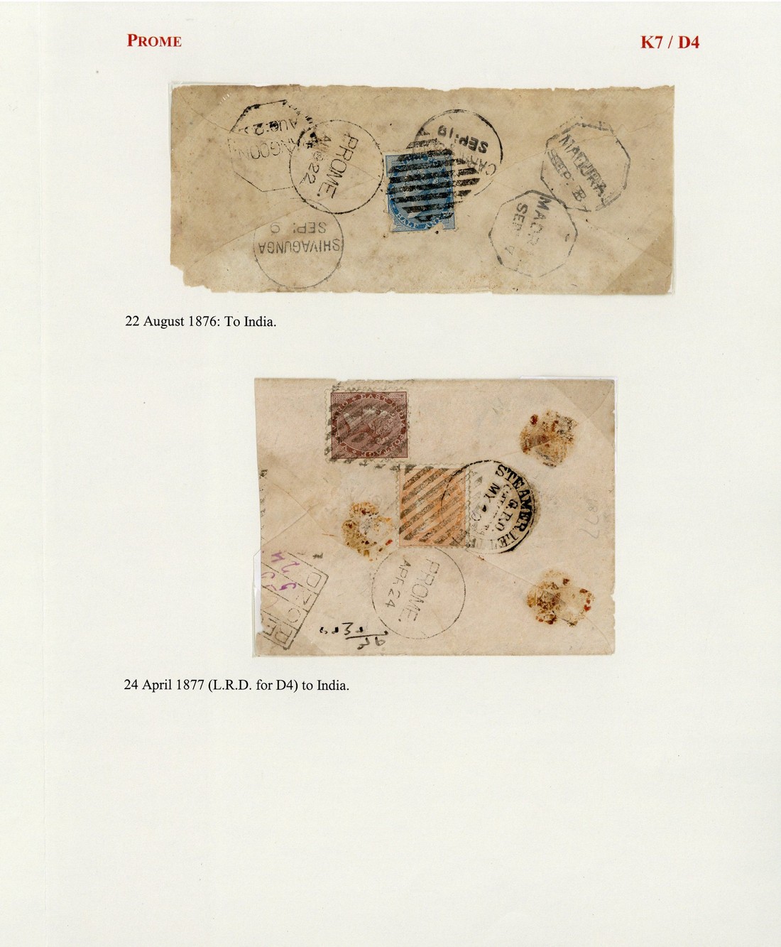 1876 (22 Aug.) envelope (small faults) to India bearing, on reverse ½a. (defective), 1877 (24 Apr.) large part envelope to India bearing, on reverse, 1a. and 2a., all tied by diamond of bars (Type K7) and both showing "prome" c.d.s. (Type D4; earliest and latest recorded dates) alongside; and 1881 (22 May) 1½a. stationery card to USA cancelled by diamond of bars (Type K7) and showing "prome" c.d.s. (Type D5) alongside