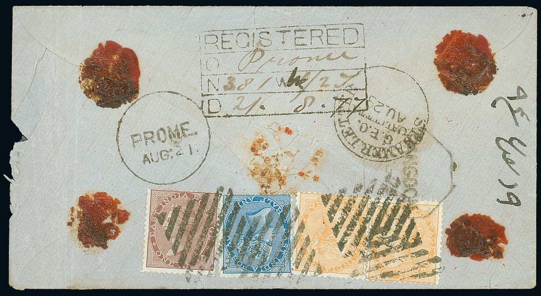 1877 (21 Aug.) envelope registered to Calcutta bearing, on reverse, ½a., 1a. and 2a. (2), all tied by diamond of bars (Type K7), showing "prome" c.d.s. (Type D5) and Type R2 registration d.s. alongside. An attractive franking. Photo