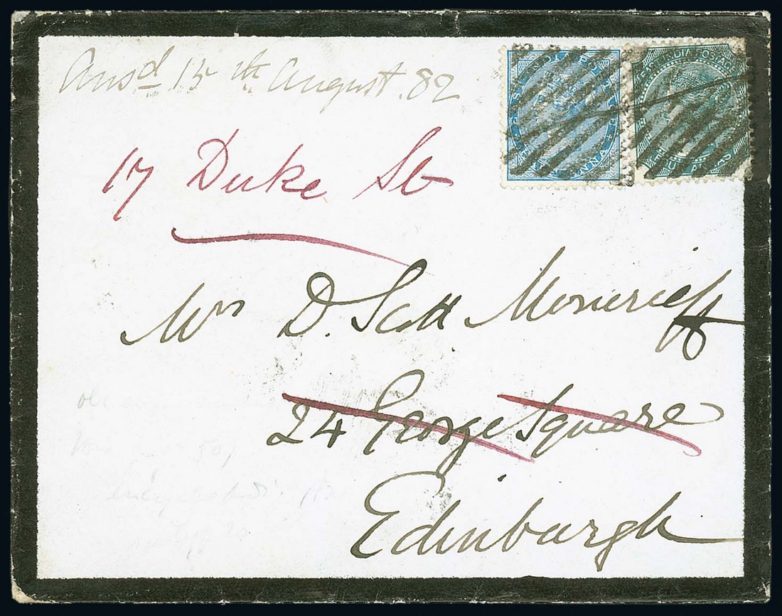 1882 (3 July) mourning envelope to Edinburgh, bearing ½a. and 4a. crossed by pen stroke, cancelled by diamond of bars (Type K4) and showing, on reverse, "rangoon c.r.h" c.d.s. (Type D3). Photo