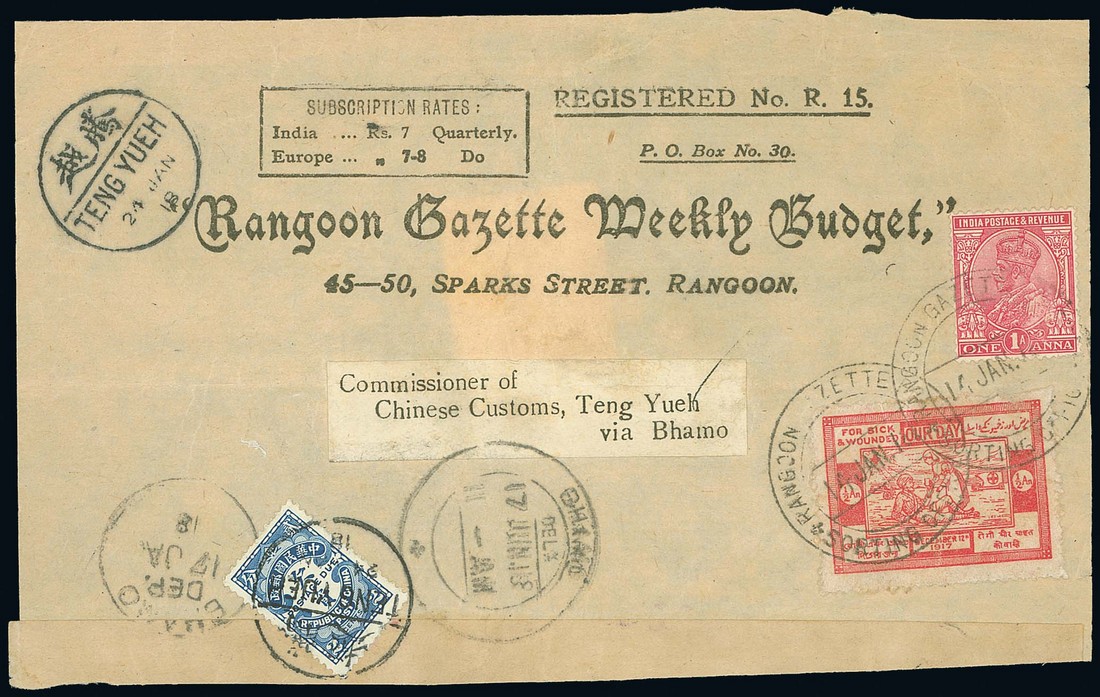 1918 (14 Jan.) "Rangoon Gazette Weekly Budget" newspaper wrapper front to Teng Yueh China, bearing 1a. and "our day" ½a. charity stamp, both tied by "rangoon gazette press/s.o." double-ring d.s. (Type D1), showing Bhamo transit d.s. and with China Postage Due 2c. applied and cancelled on arrival; 1931 (10 Jan.) newspaper wrapper to India, bearing ½a. similarly cancelled, also small piece and KGV 1r. Photo for first
