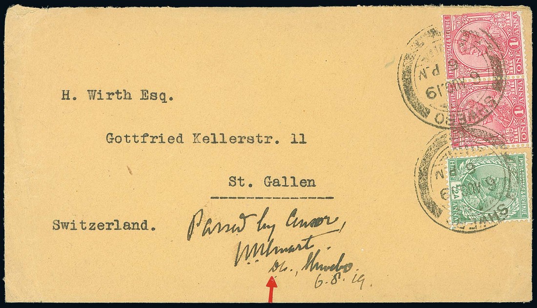 1919 (6 Aug.) envelope bearing ½a. and 1a. pair, and (29 Oct.) 1a. stationery card, both addressed to Switzerland, cancelled by "shwebo" double-ring d.s. (Type KD8; the latter the latest recorded date) and manuscript "Passed by Censor", initials and date. Photo for both