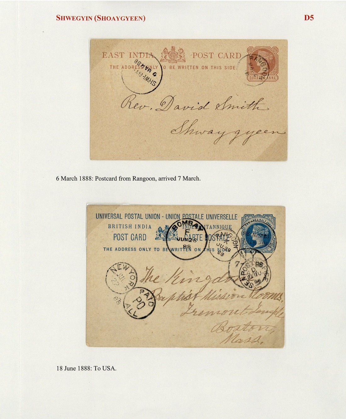 1888 (6 Mar.) ¼a. stationery card from Rangoon to Shwegyin showing Type D5 arrival c.d.s. at upper left; and 1888 (18 June) 1½a. stationery card to USA, cancelled by "shwegyeen" c.d.s. (Type D5) and showing Rangoon, Bombay, Sea Post Office and New York transit datestamps