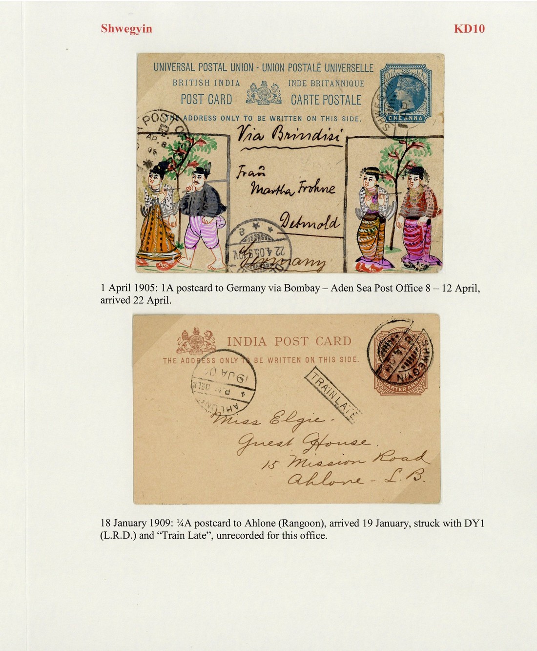 1905 (1 Apr.) 1a. stationery card to Germany with coloured drawings in both lower corners, and 1909 (18 Jan.) ¼a. stationery card to Rangoon, both cancelled by "shwegyin" segmented c.d.s. (Type KD10), the latter showing framed "train letter" and "ahlone" arrival d.s. (19.1; latest recorded date)