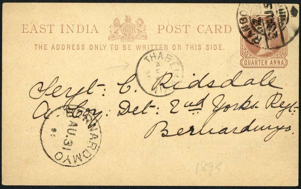 1895 (23 Aug.) ¼a. stationery card from Rangoon to Bernardmyo, showing "thabeikkyin" transit c.d.s. (27.8; Type D2, latest recorded date)