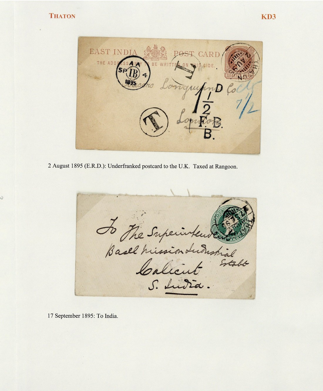 1895 (2 Aug.) ¼a. stationery card to London, cancelled by "thaton" segmented c.d.s. (Type KD3; earliest recorded date), showing "T" in circle and London "1½d/f.b./b." h.s.; 1896 (17 Sept.) ½a. stationery envelope to Calicut similarly cancelled