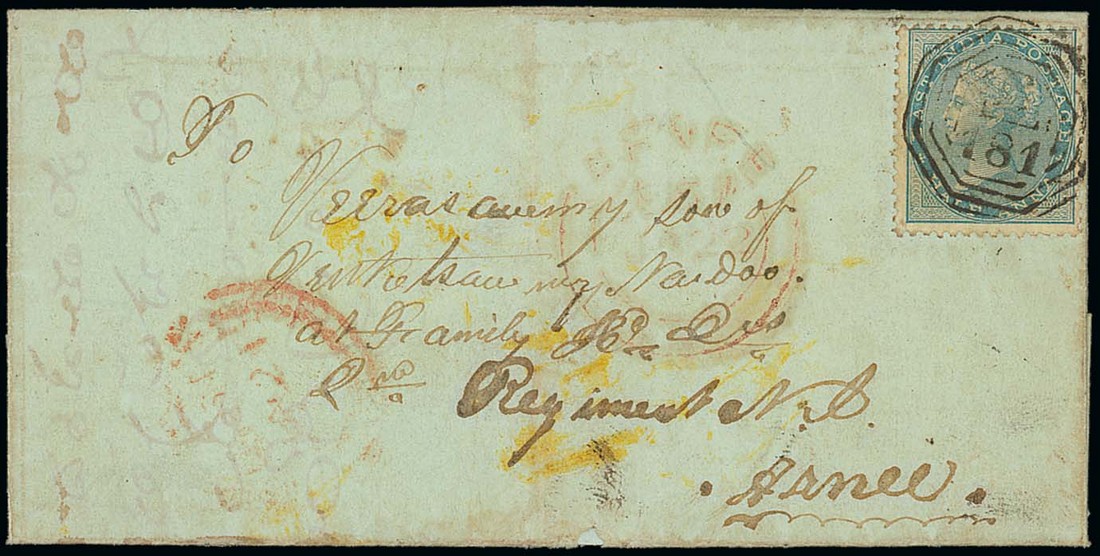 1860 (3 Dec.) entire to a native soldier in India, bearing ½a. clearly tied by "B/181" obliterator and showing red transit datestamps alongside. Photo