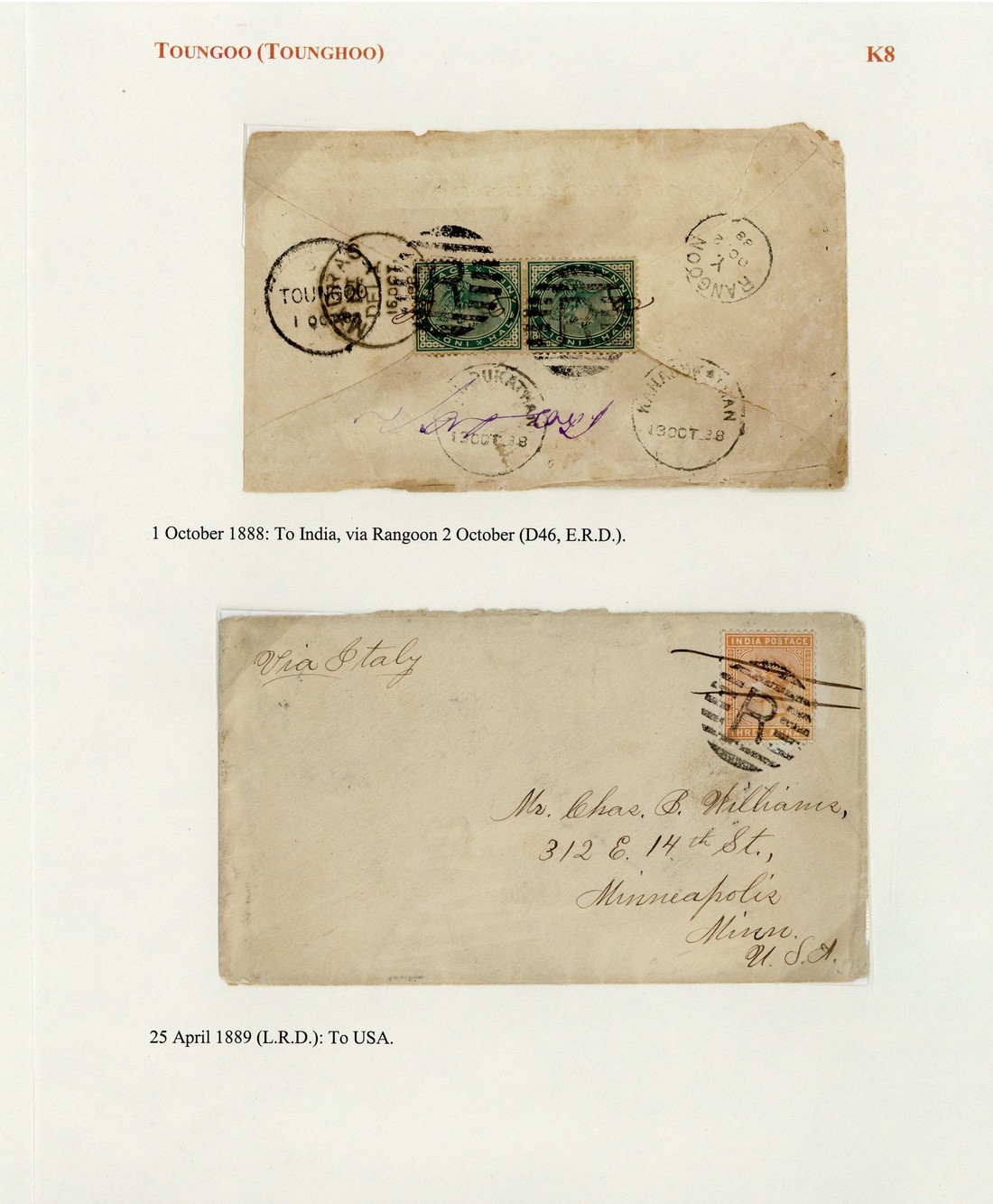 1888 (1 Oct.) envelope (faults) to India bearing, on reverse, ½a. pair tied by "R" in circle of bars (Type K8) and showing "toungoo" (Type D7) with transit and arrival datestamps alongside; 1889 (25 Apr.) envelope to USA, bearing 3a. tied by pen strokes and "R" in circle of bars (Type K8; latest recorded date)