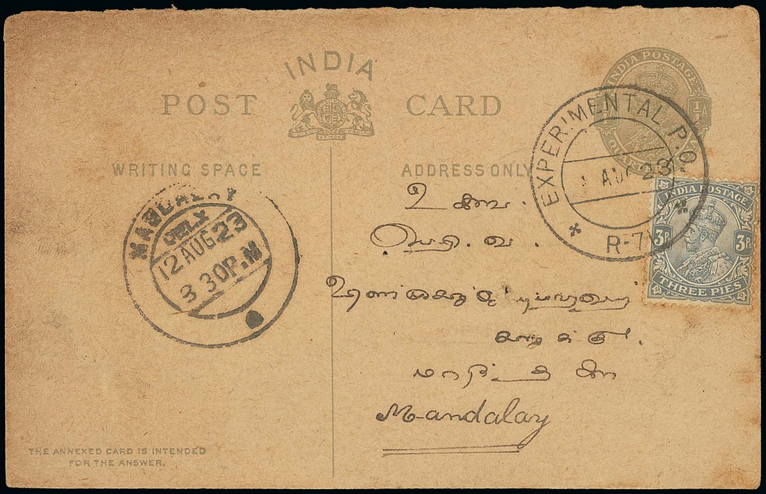 1923 (8 Aug.) ½a. stationery card (overall disclouration) to Mandalay, uprated 3p., cancelled by "experimental p.o./R-71" double-ring d.s. (Type D1). Scarce. Photo