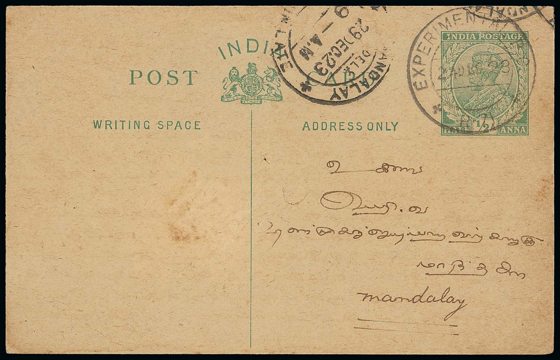 1923 (24 Dec.) ½a. stationery card (spiked) to Mandalay, clearly cancelled by "experimental p.o./r-71" datestamp (Type D1). Scarce. Photo