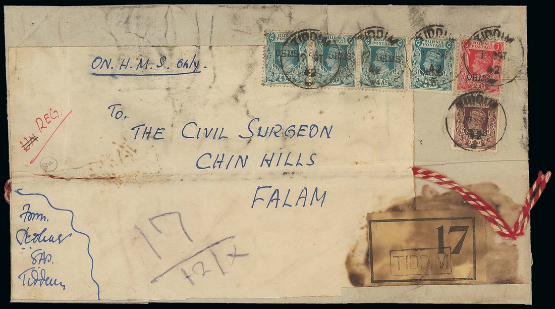 1942 (12 Oct.) OHMS parcel wrapping registered from Tiddim to "The Civil Surgeon, Chin Hills, Falam", bearing India 1a., 2a. and 4a. strip of three and single each with typewritten "OHMS" and tied by "tiddim" c.d.s. (Type D3), and showing provisional registration label (stained by affixative); some creases as to be expected with item of this nature. A remarkable franking. Very rare. Photo