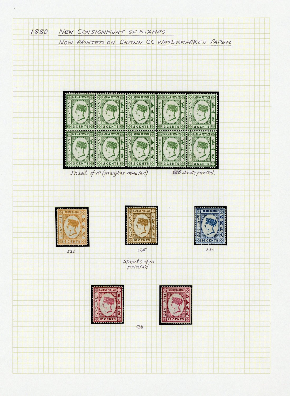 1879-94 predominantly mint collection of Queen's head issues including 1879 (May) 16c. (3), 1880 CC 2c. sheet of ten without margins to 16c. with additional 8c. (2, one used) showing no dot at lower left (the mint with small thin and the used with light stain at right), 1881 (Mar.) 8c. on 12c. (not guaranteed), 1881 (June) 8c. on 12c. (2, one used), 1883 CA 2c. (no margins) and 40c. sheets of ten, 8c. (used), 10c. (3, two used), 16c. (3, two used) and 40c., 1885 (June) 2c. on 8c. (2, one with surcharge diagonal and showing no dot at lower left - thinned), 1885 (July) 2c. on 16c., 1885 (Sept.) 2c. on 8c. mint (2, one a corner example showing no stop at lower left) and used, 1885-86 CA 2c. (5), 8c. deep violet (5 including a block of four), 8c. mauve (2), 10c. and 16c. plus 2c. and 10c. sheets of ten, 1892-93 no wmk. 2c. to 40c. plus 2c. sheet of thirty, 6c. and 8c. sheets of ten, 1892 (Dec.) 2c. on 40c. (2, one used) and 1894 litho 2c. to 40c. (2 sets, one handstamped "specimen") and 6c. and 16c. sheets of ten. A fine lot. Cat. £8200+