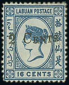 1885 (June) "2 cents" on 16c. blue, fine unused with part original gum. Holcombe Certificate (1994). S.G. 24, £950. Photo