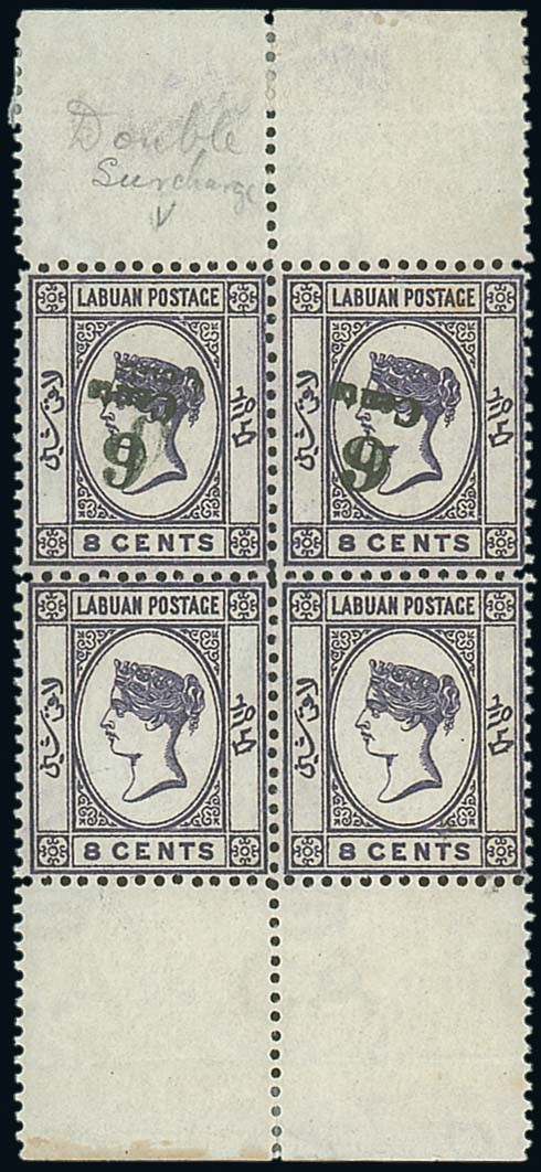 1891-92 "6/cents" on 8c. deep violet block of four with margins at top and at bottom, the upper pair with surcharge inverted, the lower pair with surcharge omitted, the upper left stamp also showing "Cents" double, fine mint. Rare. B.P.A. Certificate (1965). S.G. 34f, £3800. Photo