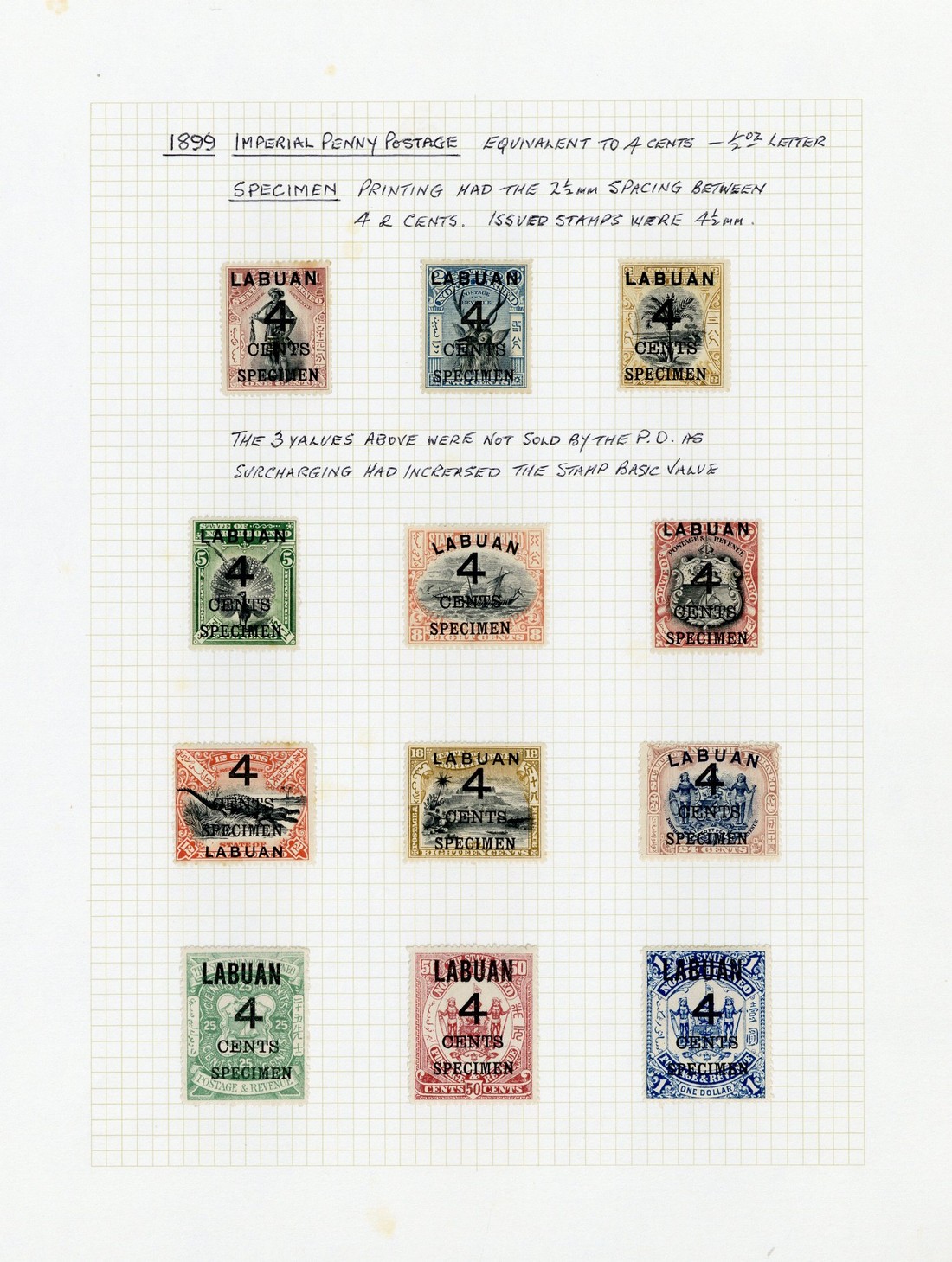 1899 (July) 4c. on 1c. to 4c. on $1 set of twelve including the unissued, each overprinted "specimen" and 4c. on 5c. to 4c. on $1 set of nine mint with additional 4c. on 12c. and 4c. on 24c.; 1900-02 Pictorial 2c. to 16c. set of six mint with additional 2c. and 4c. (both); 1902-03 Crown 1c. to $1 set of twelve overprinted "specimen"; and 1904 4c. on 5c. to 4c. on $1 set of nine mint with additional 4c. on 24c.; some with tone spotting mainly on reverse though most are fine. Cat. £1000