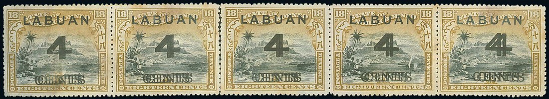 — 4c. on 18c. black and olive-bistre horizontal strip of five, variety surcharge double and showing the two surcharges getting progressively wider apart from left to right, unused without gum; severed between second and third stamps, the first stamp badly thinned and with some lesser faults. A rare multiple. S.G. 106a, £2000. Photo