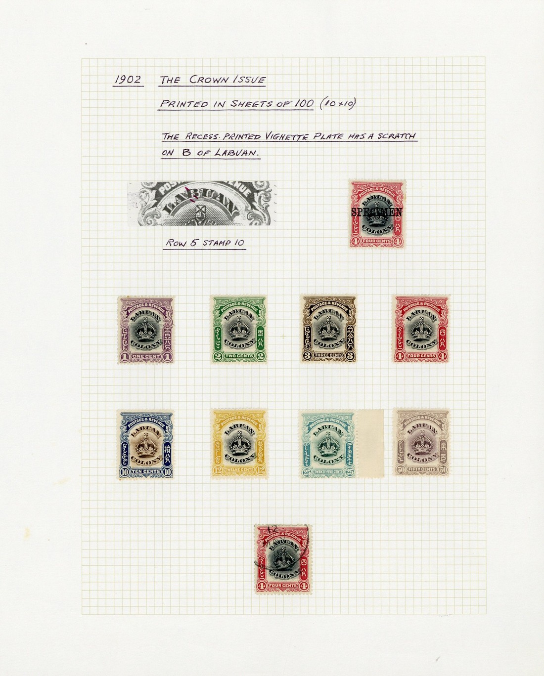 1902-03 Crown 1c., 2c., 3c., 4c. (3, one overprinted "specimen" and one used), 10c., 12c., 25c. and 50c., each showing variety line through "B", fine mint. Cat. £960