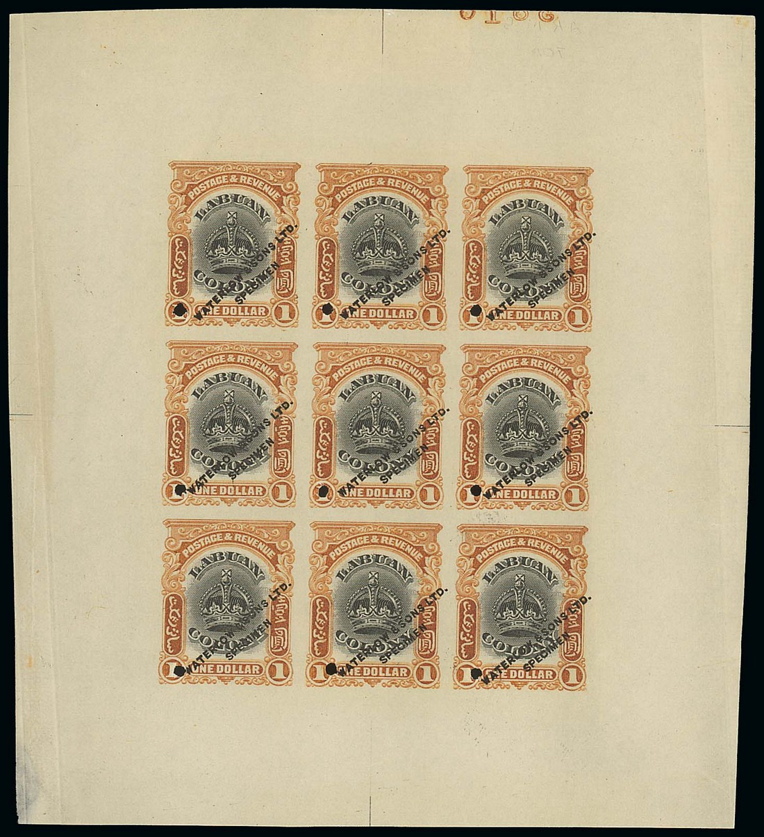 — $1 black and chestnut printer's sample imperforate sheet of nine showing die number "3816" in reverse at top, each stamp overprinted "waterlow & sons ltd./specimen" (Type WS1) and with punch hole at lower left, fine. Photo