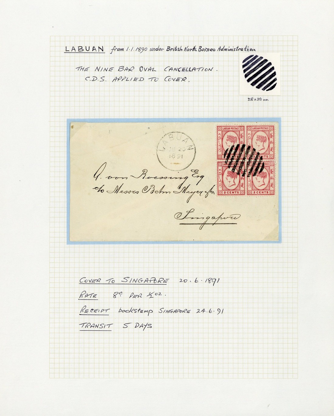 1891 (20 June) envelope to Singapore, bearing 1886 2c. pale rose-red block of four, centrally cancelled by oval of bars and showing Labuan c.d.s. alongside with arrival datestamp (24.6) on reverse