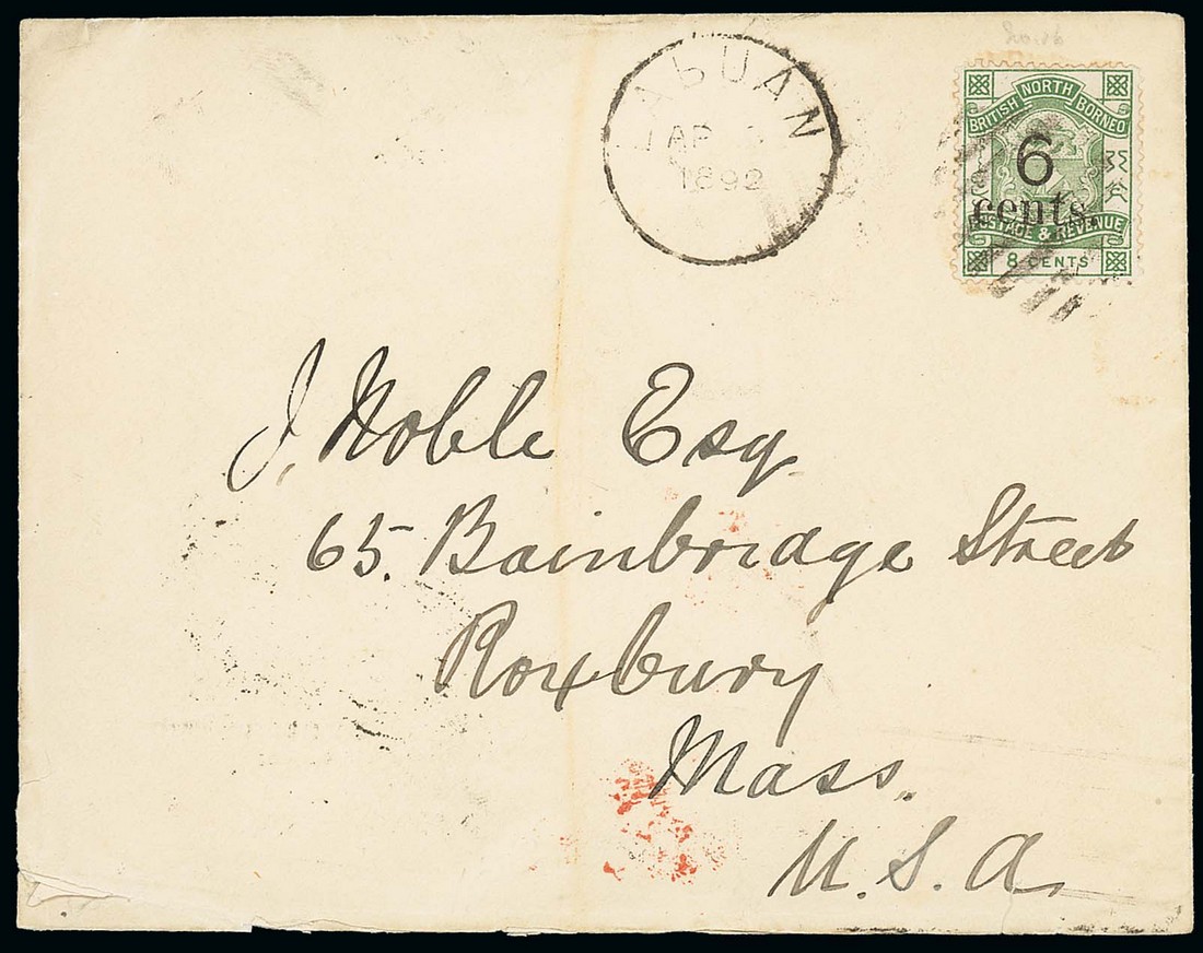1892 (Apr.) envelope to USA, bearing North Borneo 1891 6c. on 8c. tied by oval of bars and showing Labuan c.d.s. alongside and, on reverse, Singapore (18.4), London, New York and arrival datestamps. Photo
