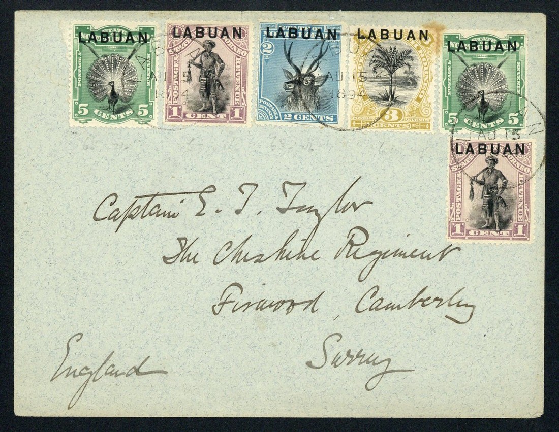 1894 (15 Aug.) envelope to Surrey, bearing 1894 Pictorial 1c. (2), 2c., 3c. (one corner stained) and 5c., all tied by light Labuan c.d.s. and showing arrival datestamp (24.9) on reverse