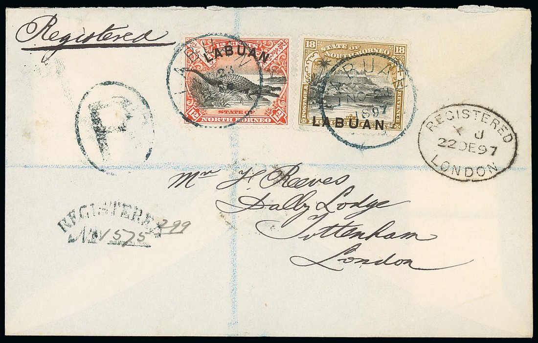 1897 (21 Nov.) "Reeves" envelope registered to London, bearing 1897 12c. and 18c. tied by Labuan c.d.s., showing registration handstamps and arrival c.d.s. (22.12). Photo