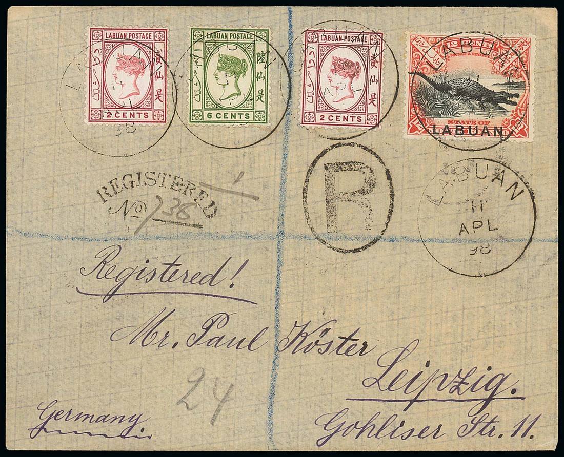 1898 (11 Apr.) envelope registered to Germany, bearing 1894 2c. (2), 6c. and 1897 Pictorial 12c., all tied by Labuan c.d.s., showing registration handstamps and, on reverse, Brindisi and Bologna transit c.d.s. Attractive. Photo