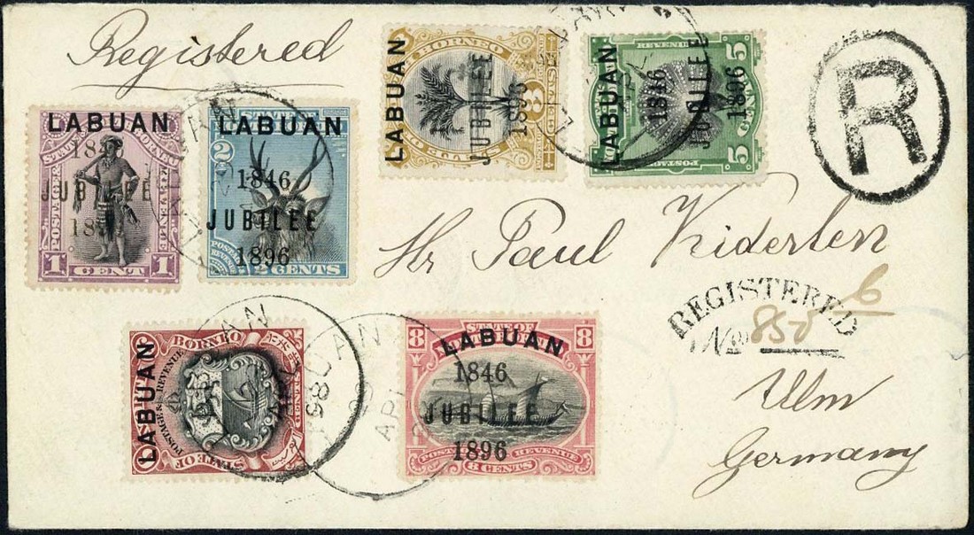 1898 (29 Apr.) "Kiderlen" envelope registered to Germany, bearing 1896 Jubilee 1c. to 8c. set of six, all tied by Labuan c.d.s., showing registration handstamps with arrival d.s. on reverse
