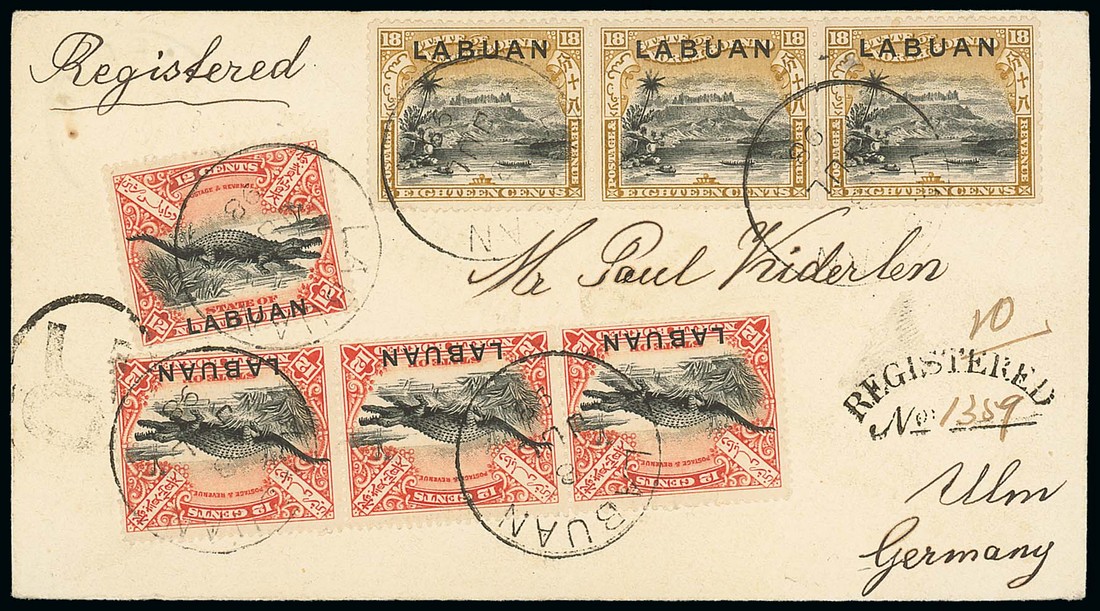 1898 (8 July) "Kiderlen" envelope registered to Germany, bearing 1897-98 12c. strip of three and single and 18c. (overprint at top) strip of three, all tied by Labuan c.d.s., showing registration h.s. with arrival c.d.s. on reverse. Photo