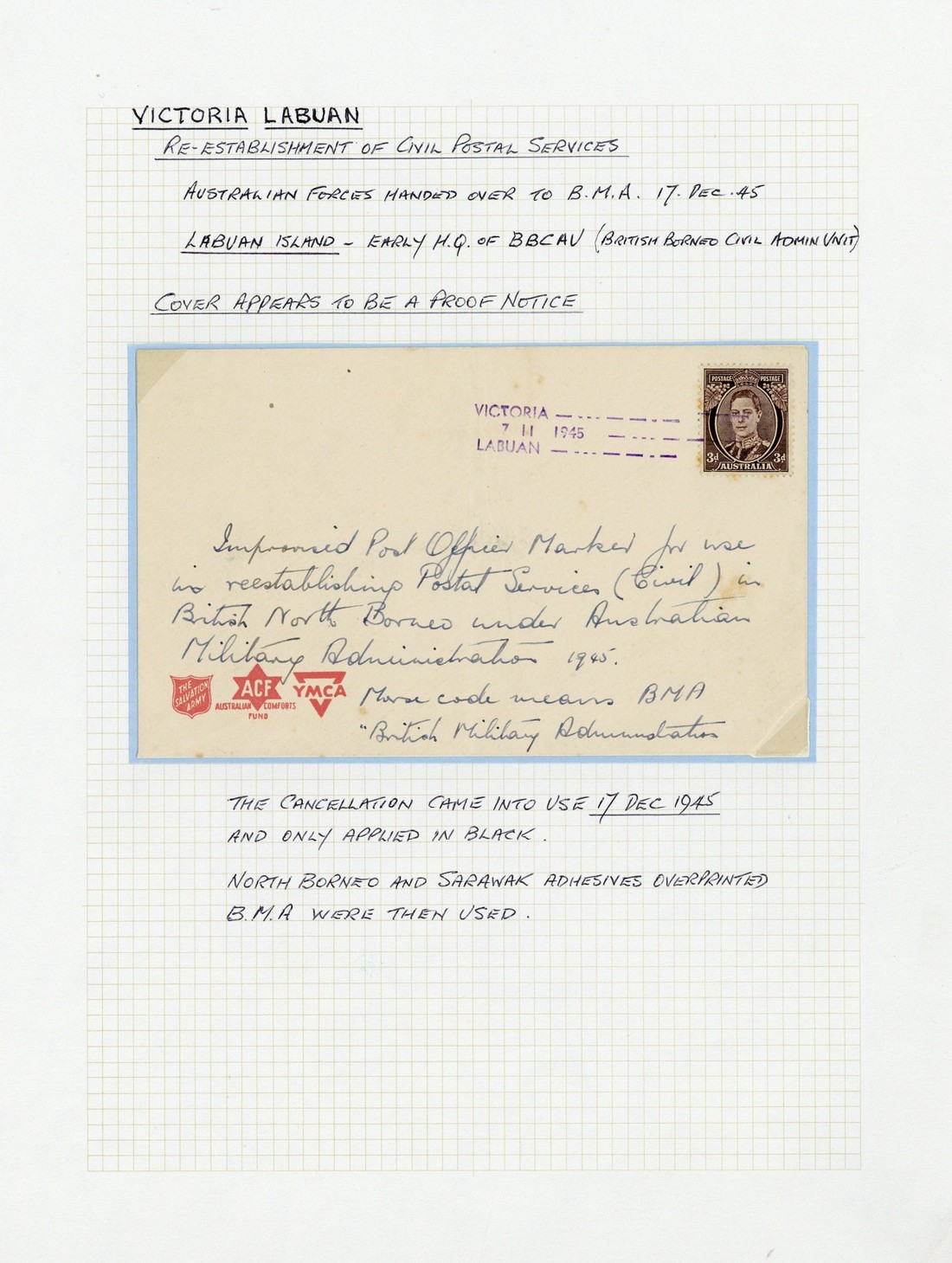 1945 (7 Nov.) unaddressed envelope bearing Australia KG VI 3d. (some lightly stained perfs) tied by fine Type D13 d.s. in violet, the face panel with details on the cancellation; 1945 (28 Dec.) envelope to Kuching bearing Sarawak BMA 4c. pair tied by Type D13 d.s. in black; 1946 (16 Apr.) envelopes (2), one registered to Wales, the other addressed locally, both bearing mixed North Borneo and Sarawak BMA values tied by Type D13 d.s. in black; 1946 (Oct.) envelope to Liverpool bearing North Borneo 15c. pair and 25c. tied by Victoria Type D14 c.d.s.; 1946 (24 Dec.) envelope to Limbang bearing Sarawak BMA 8c. tied by Type HS1; 1947 (Apr.) envelope registered to Holland bearing mixed North Borneo and Sarawak BMA franking and showing circular-framed "a.v.2" h.s. A good lot