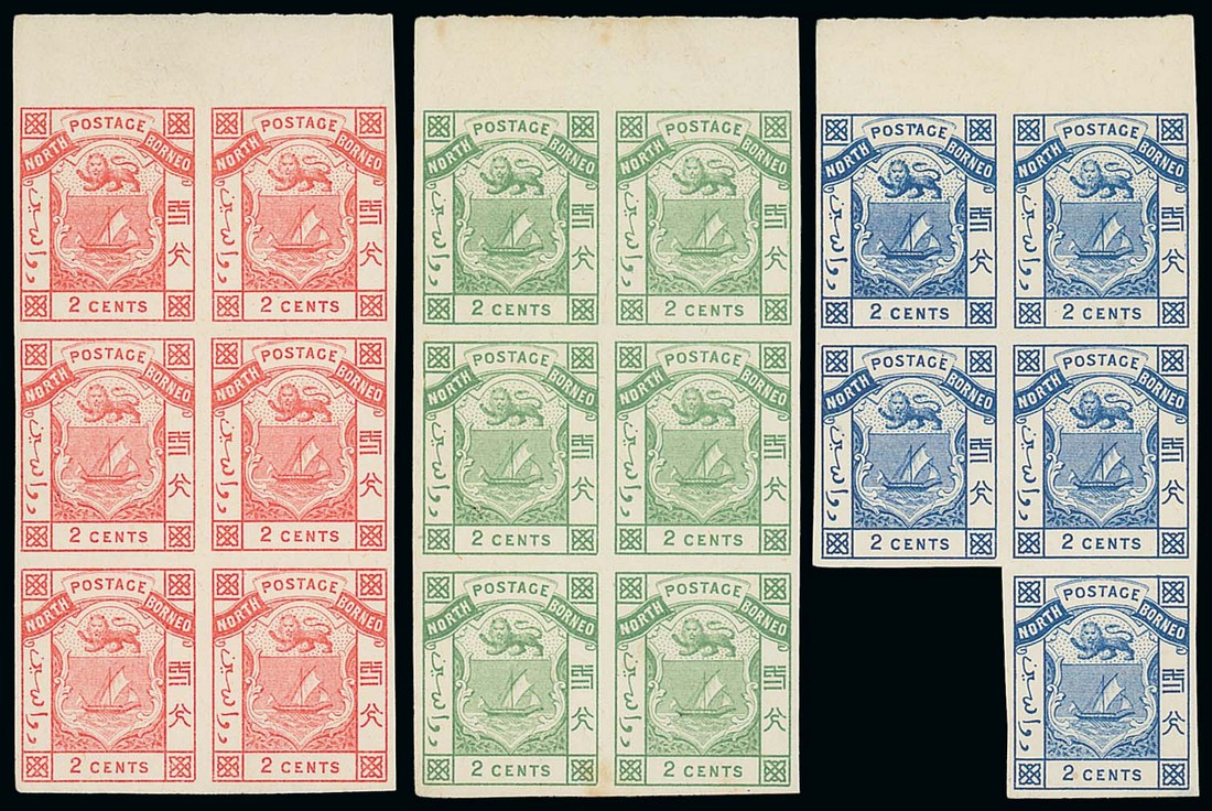 2c. pale red, 2c. green and 2c. blue, the first two in blocks of six (2x3) with margin at top, the last in block of five with margin at top, all R. 1-3/6-7, on unwatermarked thick wove paper, the 2c. green with small light tone spot at foot, otherwise fine. Rare. Photo