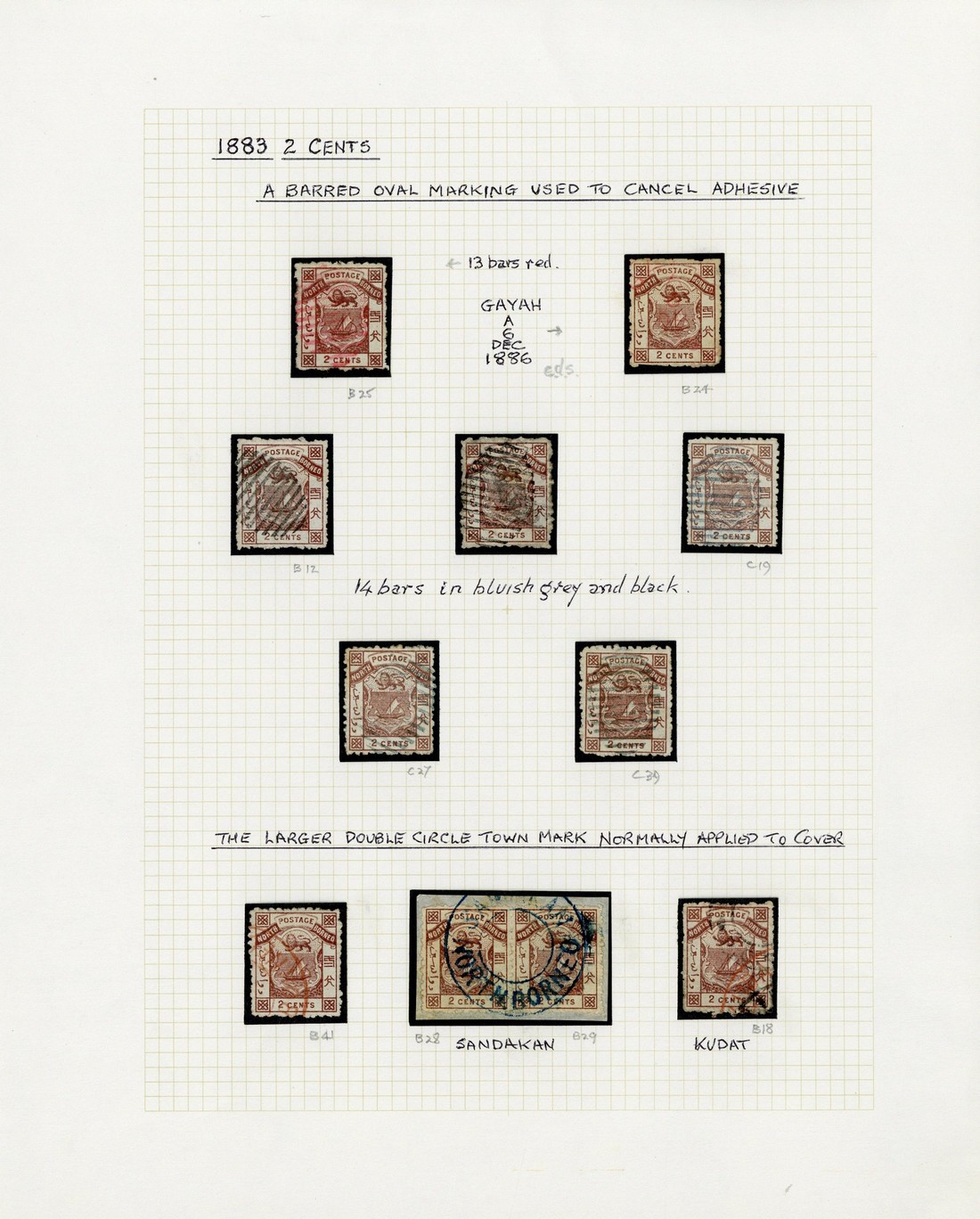 A used range comprising B12, B24 (red Gaya d.s.), B18, B25 (red oval of bars), B28-29 (on small piece cancelled by Sandakan Type D2 in blue - rare), B41, C19, C27, C39 and one unplated, mostly fine. S.G. 1, £770