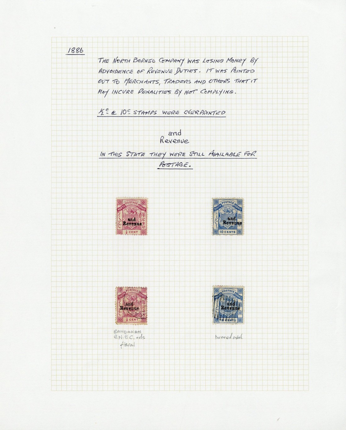 1886 (Sept.) overprinted "and/Revenue" on ½c. unused with part original gum and fiscally used, and on 10c. unused without gum and cancelled by barred oval, fine. S.G. 14-15, £765