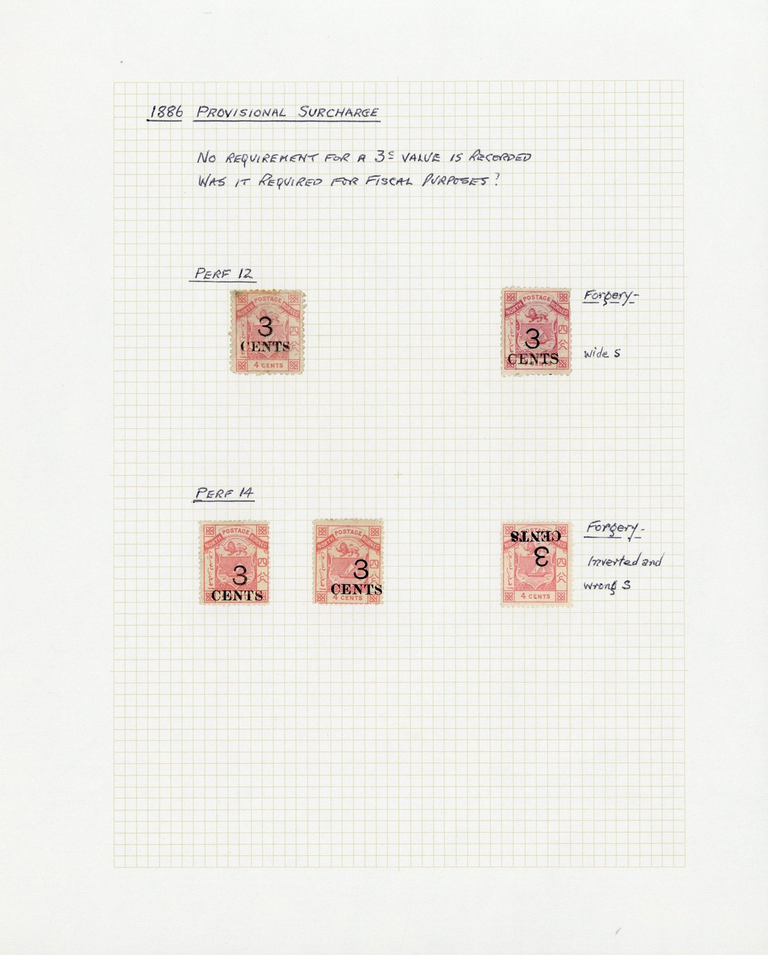 1886 perf 12 3c. on 4c. (soiled at top left) and 5c. on 8c. (no gum), perf 14 3c. on 4c. (2) and 5c. on 8c. (4, one with small thin), mounted mint; also perf 12 forgeries of both and perf 14 forgery of 3c. inverted on 4c. S.G. 16-19, £1450