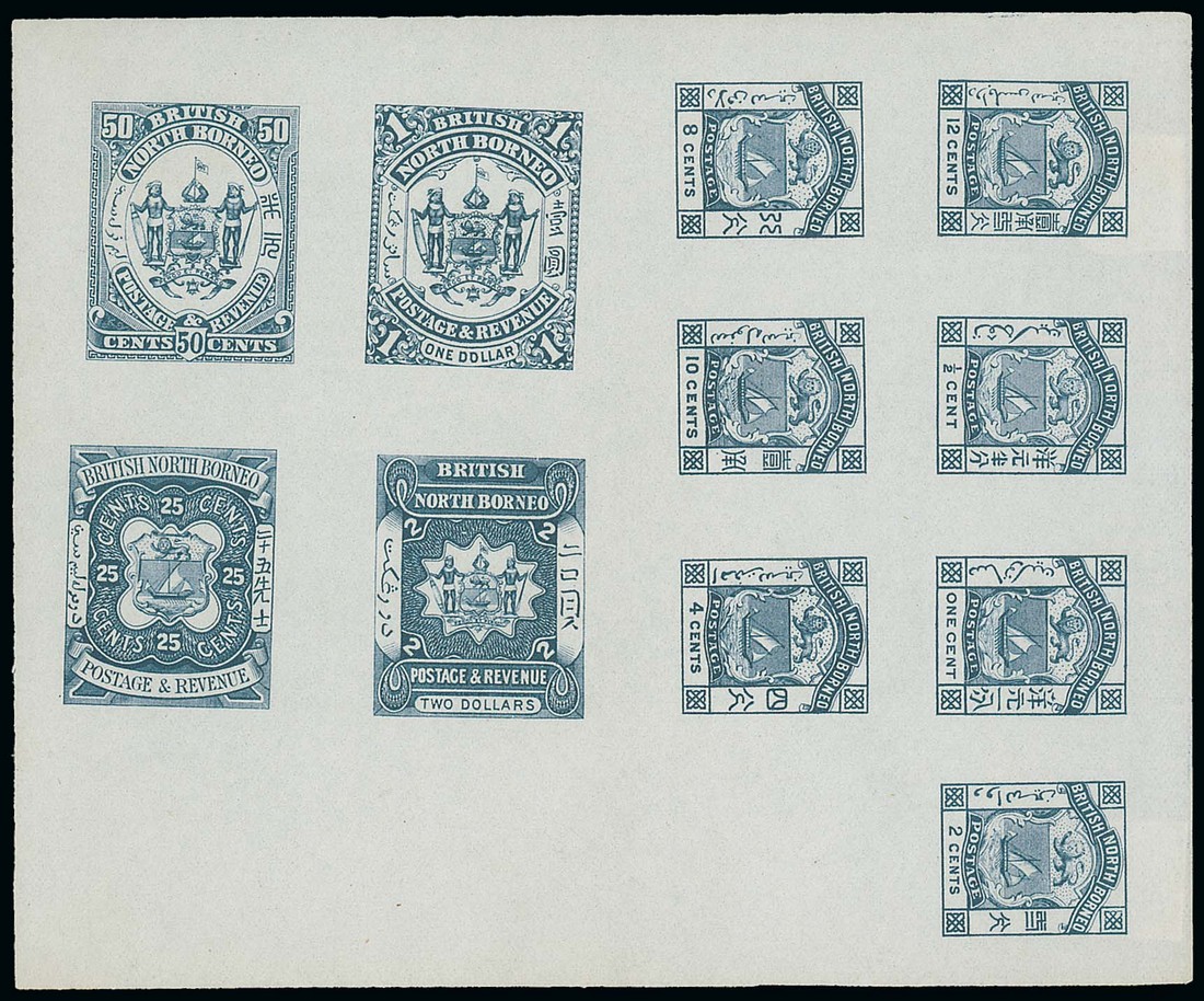 ½c. to $2 composite die proof in indigo on thin wove paper of the nine issued values and unissued 12c., 25c. and $2, fine. Photo