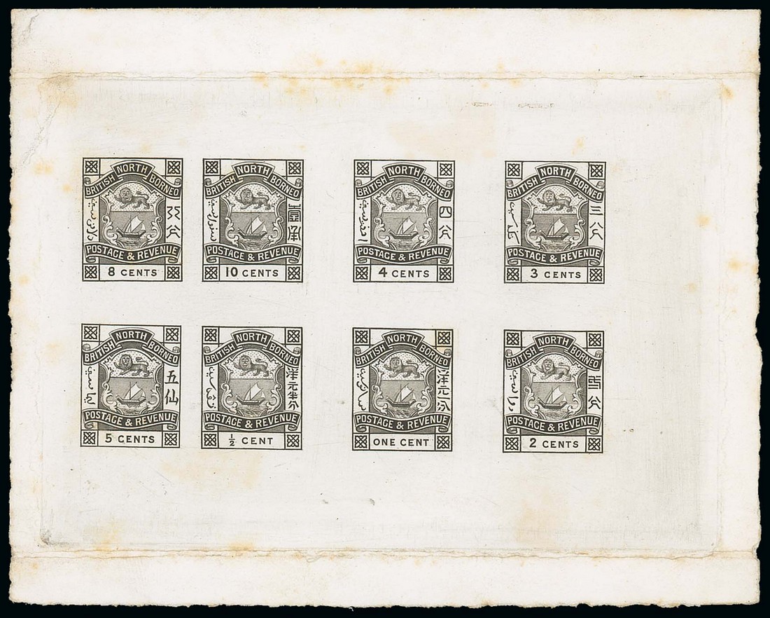 ½c., 1c., 2c., 3c., 4c., 5c., 8c. and 10c. engraved die proof sheet in black on soft card (142x114mm.), some light staining in places. Unique. Photo