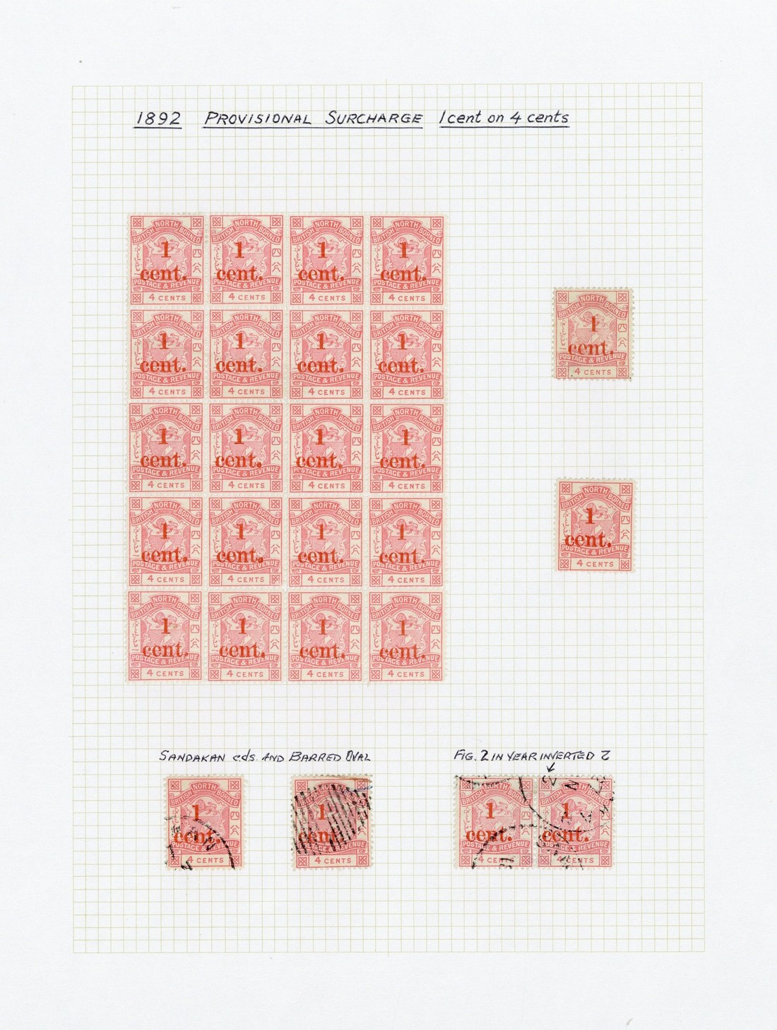 1892 (Mar.-Nov.) 1c. on 4c. unused block of twenty (4x5) and singles (2, both with gum) and used pair and singles (2); 1c. on 5c. unused corner block of forty (8x5), block of four (with gum) and singles (2), used blocks of four (2), strips of three (2) and singles (5); and 8c. on 25c. mint (2) and used; fine. S.G. 63-65, £1599