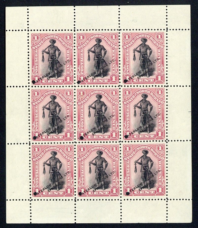 1c. in black and rose-lake, a complete sheet of nine without gum, each overprinted "waterlow & sons ltd./specimen" and with small punch hole at lower left, fine