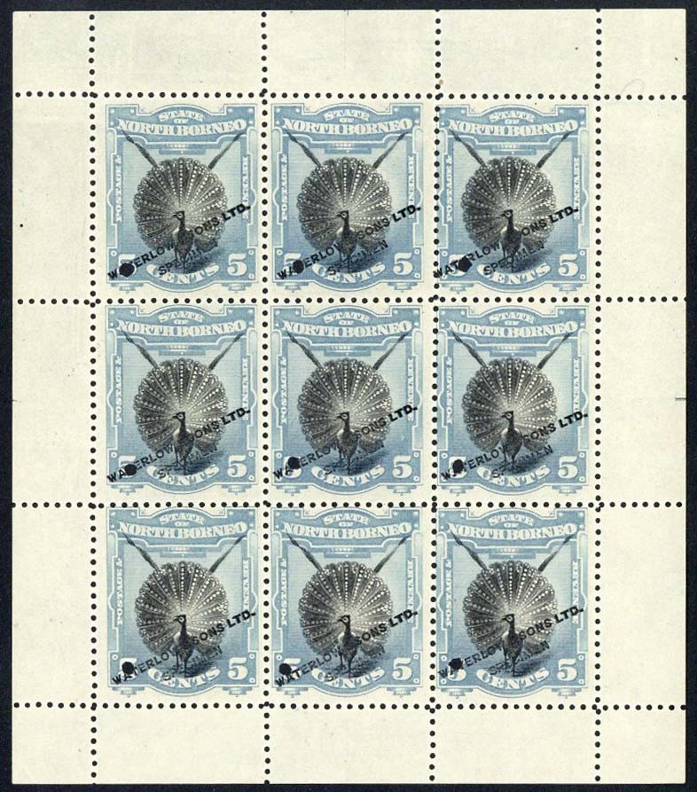 5c. in black and grey-blue, a complete sheet of nine without gum, each overprinted "waterlow & sons ltd./specimen" and with small punch hole at lower left, fine