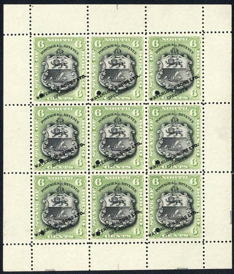6c. in black and yellow-green, a complete sheet of nine without gum, each overprinted "waterlow & sons ltd./specimen" ad with small punch hole at lower left, fine