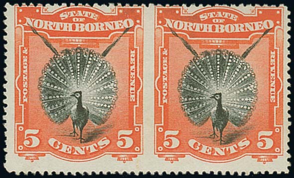 5c. black and vermilion horizontal pair, variety imperforate between, centred to top, fine mint. S.G. 72a, £900. Photo