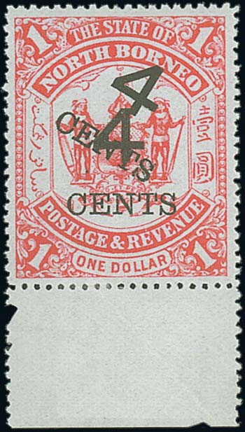 4c. on $1 with margin at foot, variety surcharge double, one diagonal, fine mint. S.G. 87a, £950. Photo