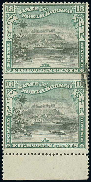 18c. black and green vertical pair with margin at foot, variety imperforate between, fine cancelled to order. S.G. 108b, £350. Photo